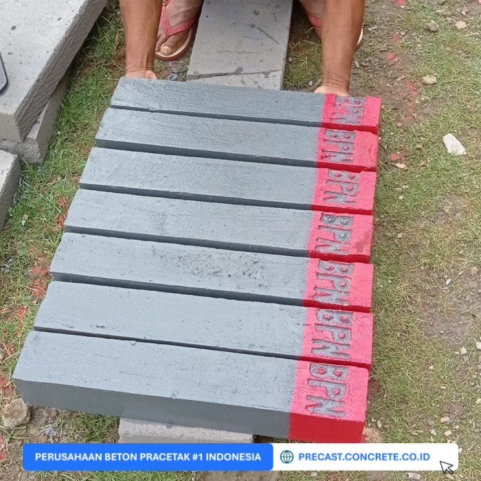 Patok beton ini memungkinkan Anda untuk menambahkan tulisan atau logo tertentu. Cocok untuk proyek-proyek besar seperti kawasan industri atau pembangunan jalan.